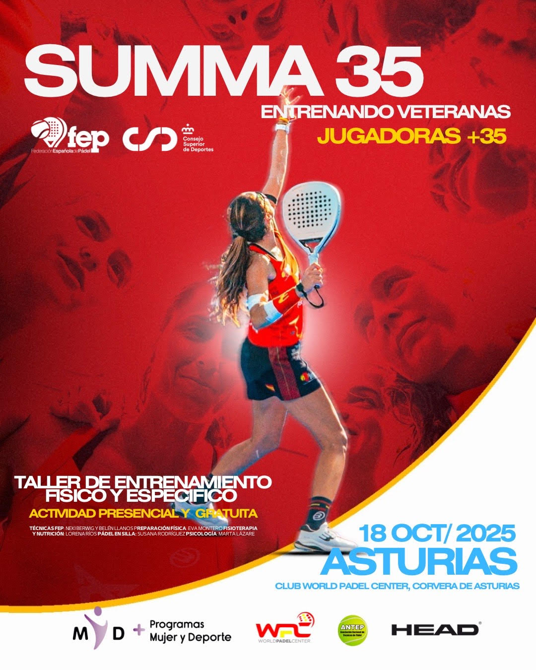 - Taller de entrenamiento específico en pista, liderado por Neki Berwig, Lic. en Ciencias de la Actividad Física el Deporte. Ex N1 del circuito profesional de pádel. Seleccionadora del equipo Femenino de Brasil. Entrenadora de jugadoras profesionales. Formada en Coaching Personal y Coaching Deportivo. Máster Programación Neurolingüística. Y la colaboración de María Belén LLanos García y tres técnicas asturianas, Tamara Valcárcel, Carla González y Alba Blanco.